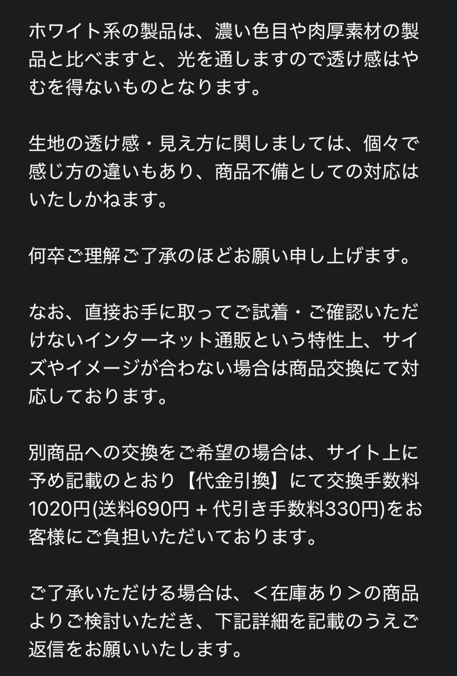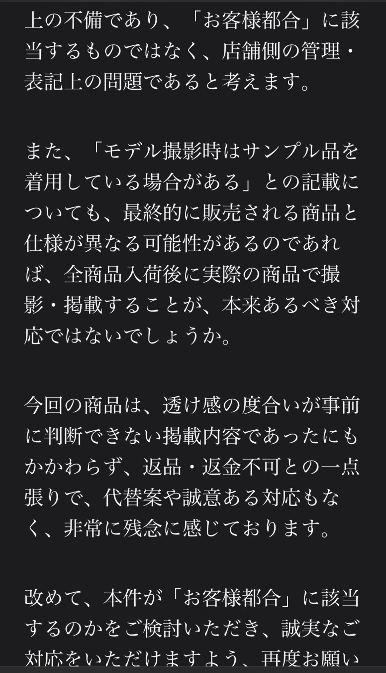「生地の透け感や見え方は個人差があるため商品不備には該当しない」