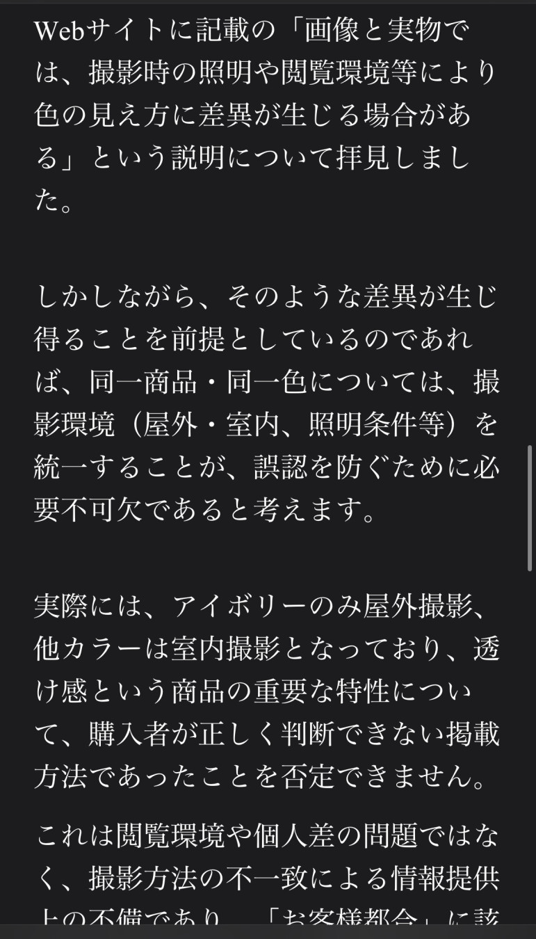 見え方に差異が出る可能性があるなら、撮影環境や見せ方は統一すべきではないかと伝えましたが、会社側の配慮不足についての説明や代替案は特にありませんでした。