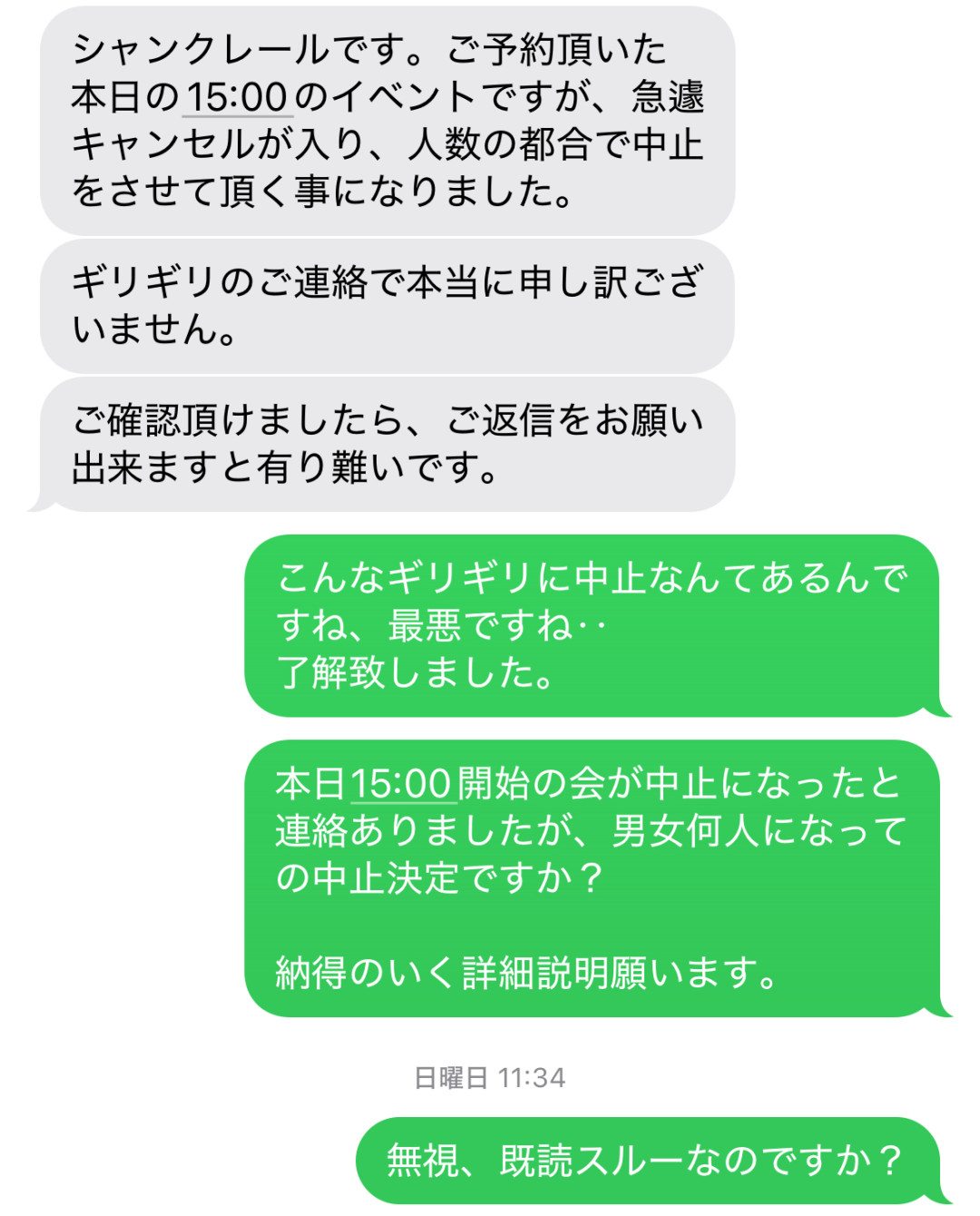 イベント参加、当日の30分前くらいに『中止』連絡がありました。理由、詳細説明のメッセージ送信に対してスルー。