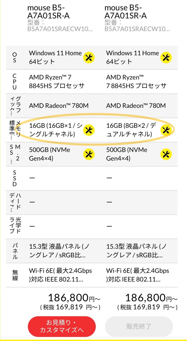 価格据え置きのまま、8GB×2(デュアル)から16GB×1(シングル)へ突然の変更。