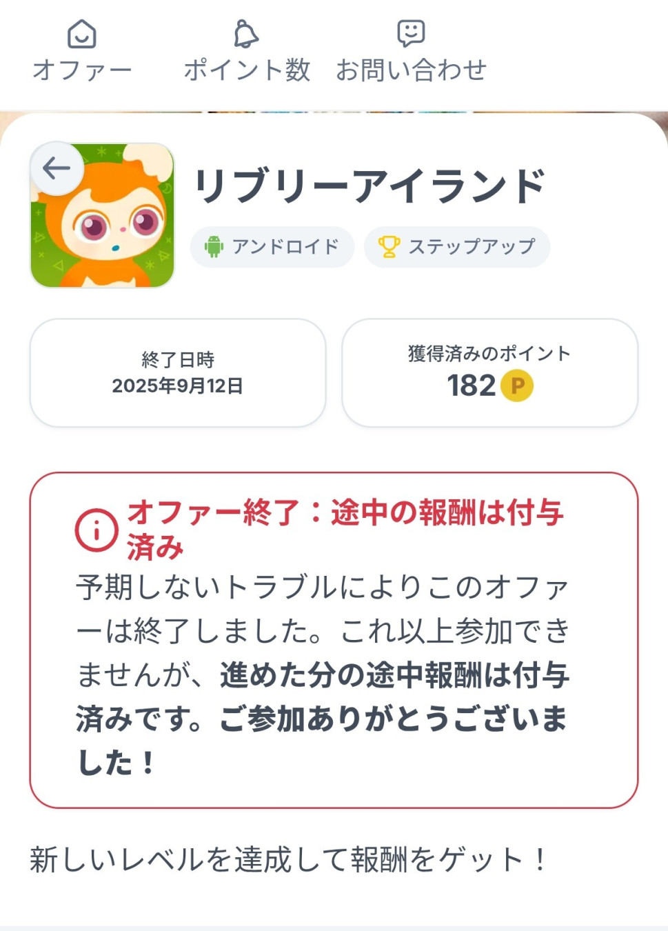 モッピー経由で広告からアプリをダウンロードしゲームを始めた。書かれた通りに始め、その日のうちにチュートリアル完了のポイントはもらえて反映した。アプリからそのままゲームを進め、同日中に報酬がもらえるレベル5までレベルを上げたが今度は報酬がなかなか反映しない。不思議に思い、レベル5まで上げた証拠のスクショと一緒に問い合わせしたら予期せぬトラブルが起きている。レベル5までのポイントは反映させるが以降はポイント報酬が渡せないとのこと。意味が分からないし、予期せぬトラブルについて説明してもらおうとしても問い合わせは開けずシャットダウン。全てクリアで8000ポイントだけど、予期せぬトラブルといいように理由をつけて元からポイントは寄越さないつもりだと思う。同じくモッピーからリヴリーを始めた人でしっかり報酬貰えた人はいるのか気になる。口コミ見てほぼ報酬がもらえないポイ活アプリとも感じるから今後は利用しない。