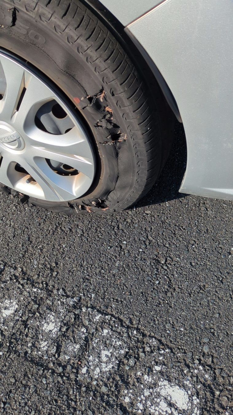 あわてて、車を止めると、左後輪がバーストしてました。